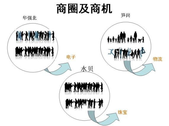 大家知道,華強北電子商圈、筍崗物流商圈都有其獨特鮮明的商業(yè)特性,形成了各自繁華的商圈和大量的商機,已成為深圳市著名的商業(yè)區(qū)。如下圖所示: